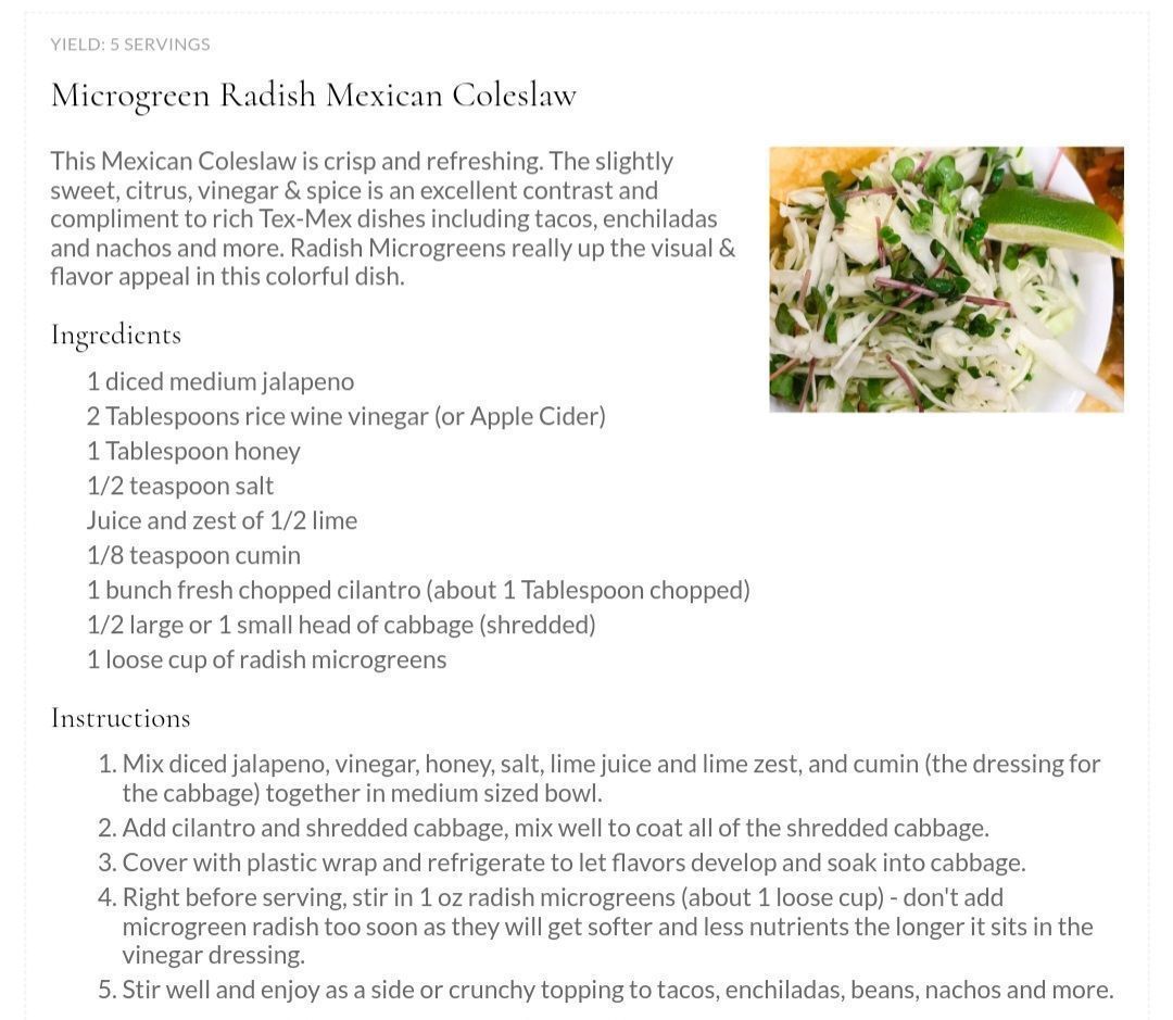 Radish microgreens are substantial and crunchy, and taste exactly like a radish. Makes a great garnish or addition to any salad or sandwich. Use sparingly for a radish accent.